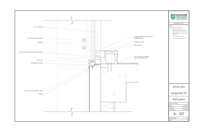 This project involved designing an exterior wall system for a building of our choice. The exterior of this art gallery was designed using a system of curtain walls and aluminum cladding with an array of vertical and horizontal louvers to add visual interest. The project focused on producing wall sections and detail drawings. All drawings were produced using AutoCAD.